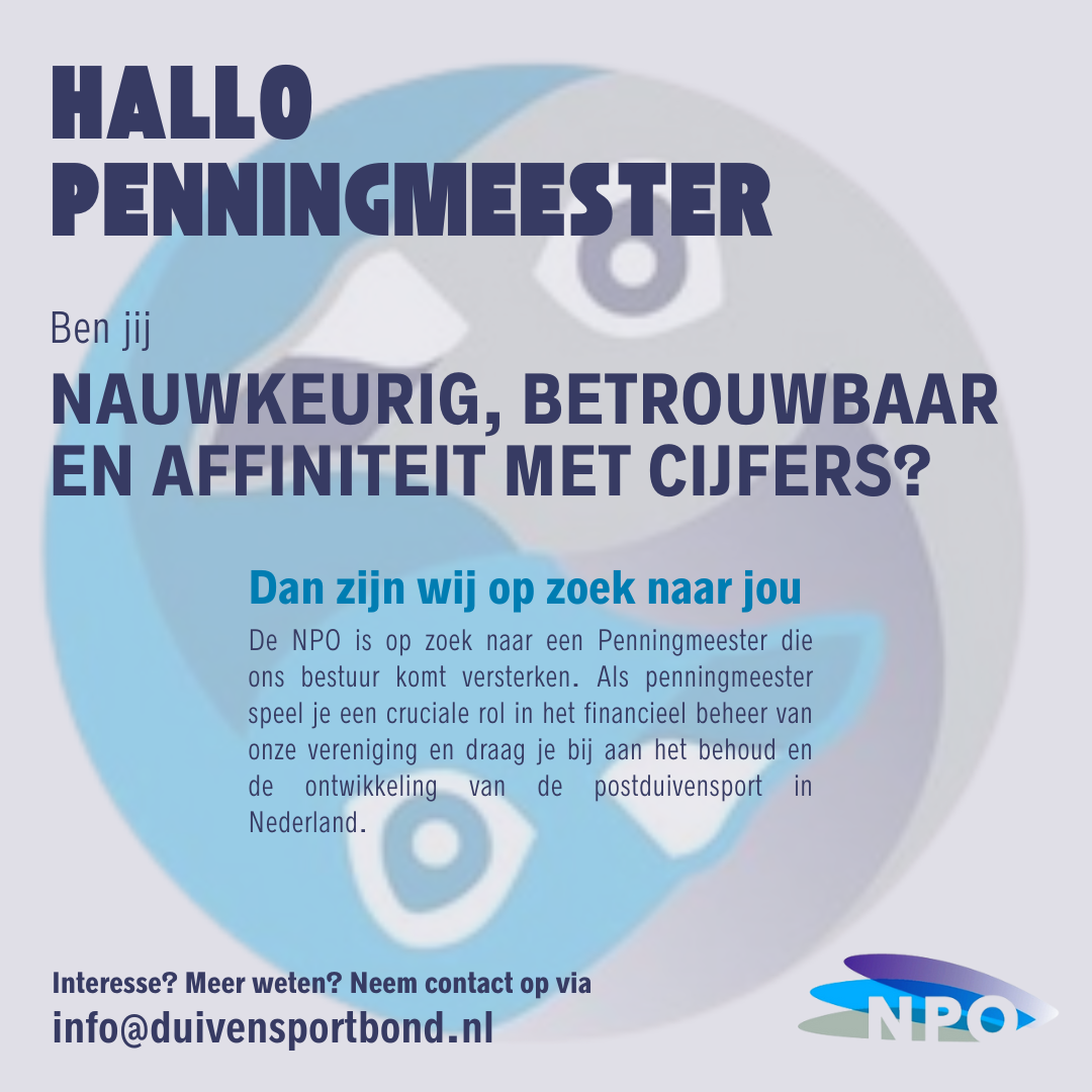 Zoals tijdens de laatste Ledenraad aangegeven heeft onze penningmeester Frank Marinus zich beschikbaar gesteld tot maart 2026. Hij helpt de duivensport deze periode te overbruggen, en dat is gezien de kennis van Frank zeker wenselijk. Dit houdt dus ook in dat wij opzoek moeten naar een penningmeester vanaf maart. Om u een goed beeld te geven over wat de functie inhoud hebben wij bijgaande tekst opgesteld.