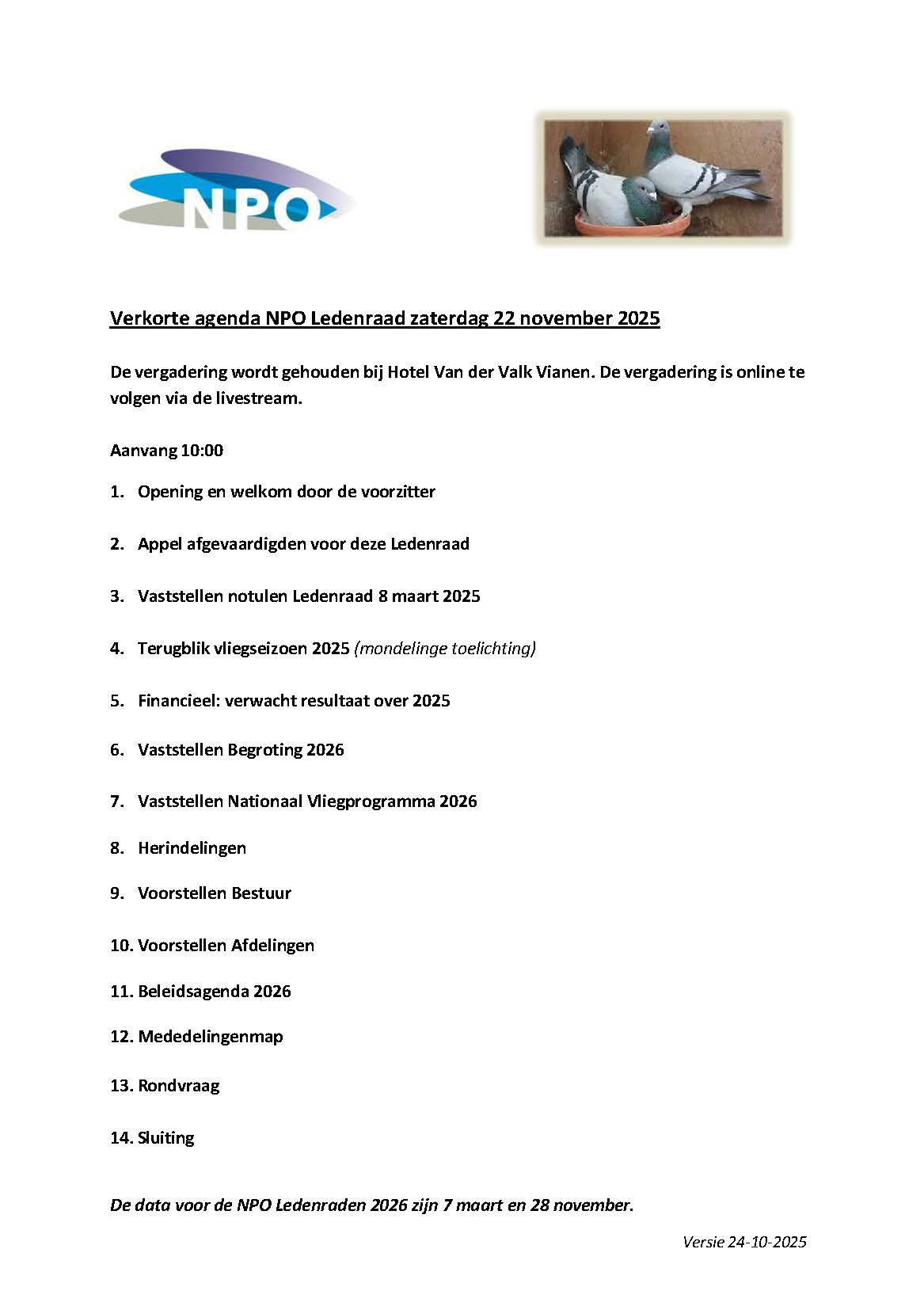 De NPO brengt wekelijks Op (de) Hoogte uit, een digitale nieuwsbrief met actualiteiten, informatie en resultaten over de duivensport en haar liefhebbers. Deze nieuwsbrief is gratis en wordt verstuurd op vrijdagmiddag. Geïnteresseerden kunnen zich eenvoudig aanmelden via onderstaande button.