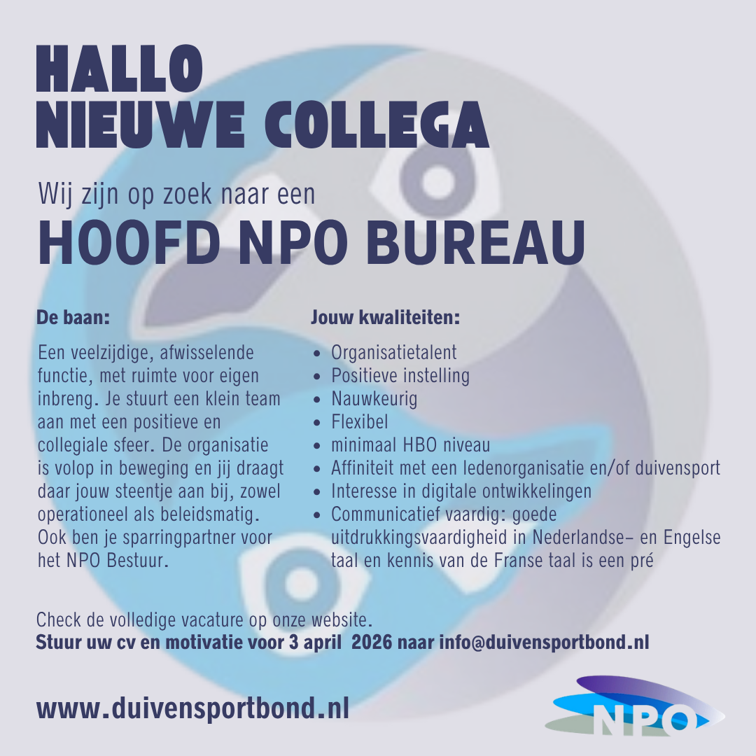 De vacature voor Hoofd NPO Bureau staat open en ik wil in de wekelijkse blog en Op (de) Hoogte ook graag aandacht vragen voor de vacature die wij hebben als NPO. Wij zoeken iemand die de komende jaren de spin in het web is in onze landelijke organisatie. Je krijgt de kans om zowel beleidsmatig alsook operationeel je bijdrage te leveren aan de toekomst van de Nederlandse duivensport! Nieuwsgierig? Klik op onderstaande button of check het nieuwsbericht op de website.